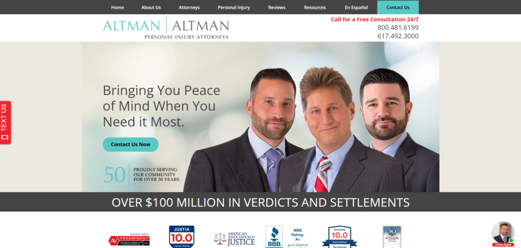Altman & Altman LLP brings decades of Boston experience. They handle car wrecks, workplace accidents, negligence claims, and wrongful death cases. Their approach stays steady and predictable. Most clients find them through word of mouth. For an experienced Boston injury attorney, they deliver.